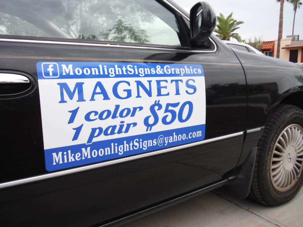 Magnetic business cards are sold in bulk. They are restricted in size to the business card size of 2×3.5″.
